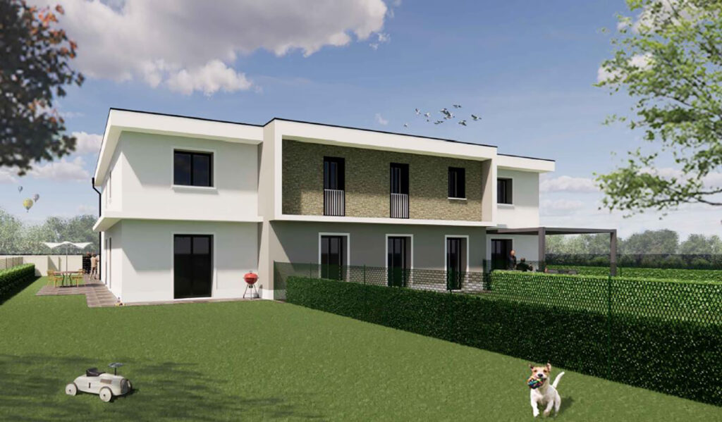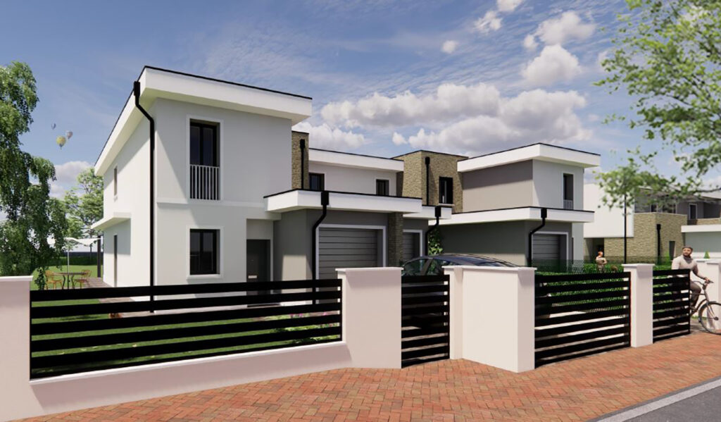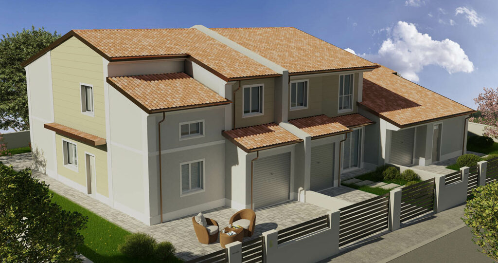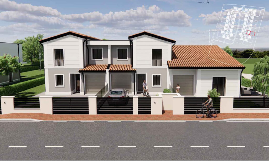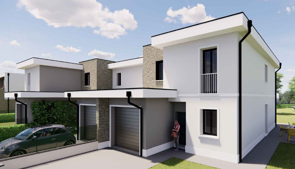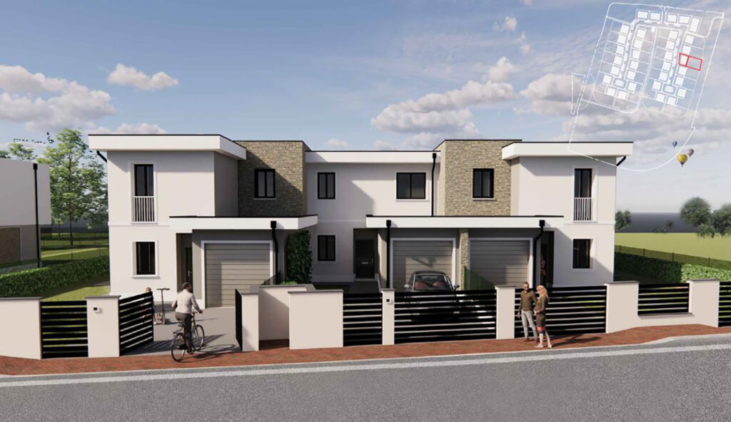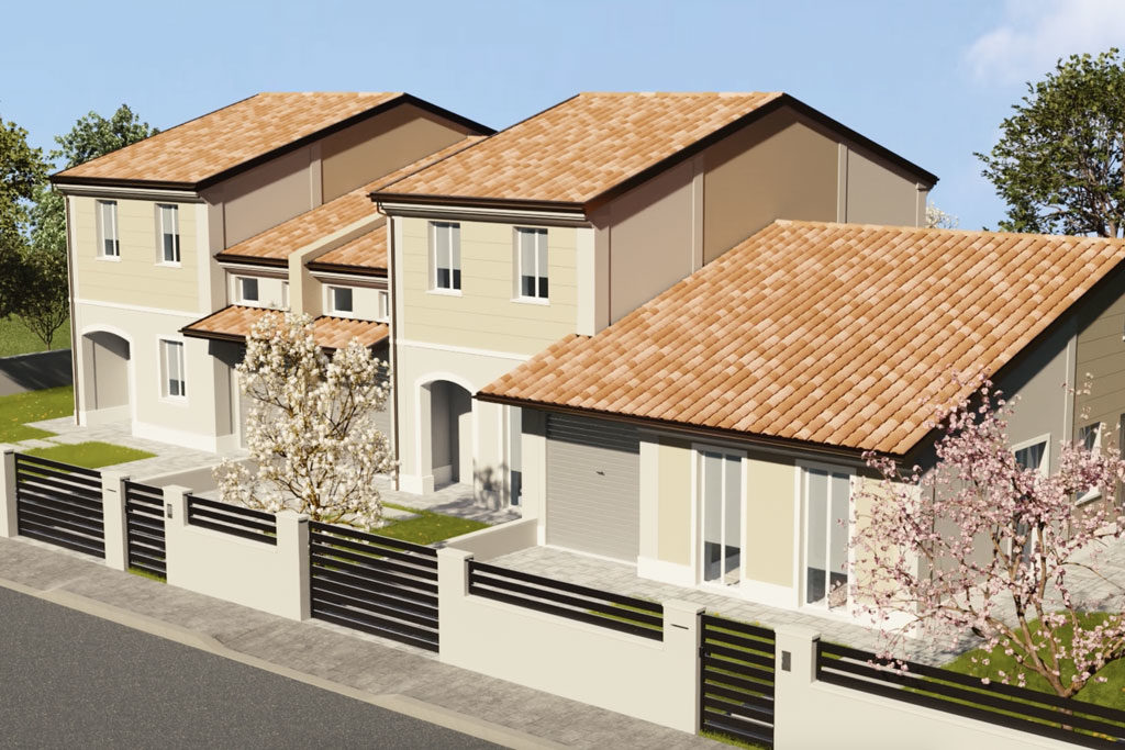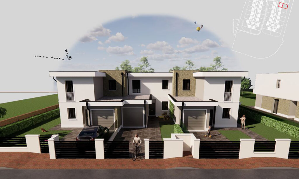 La tipologia trifamiliare proposta si compone di due villette su due piani fuori terra con: