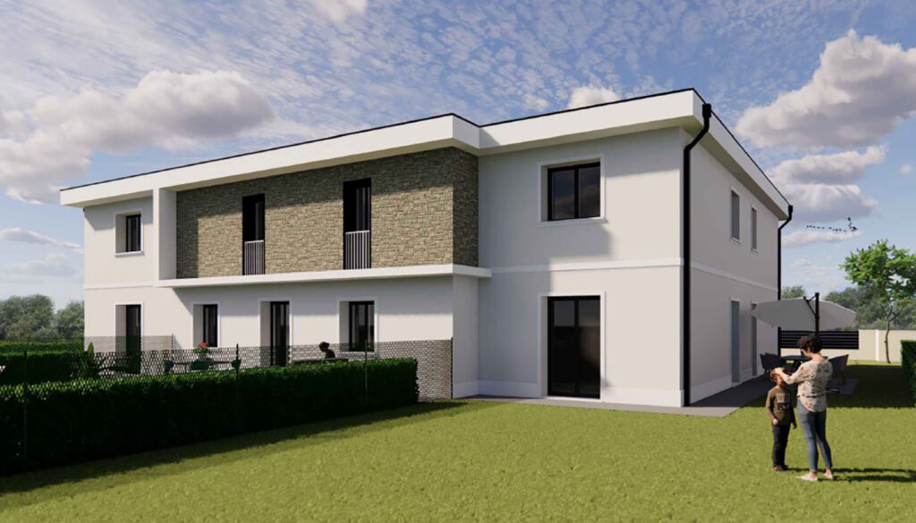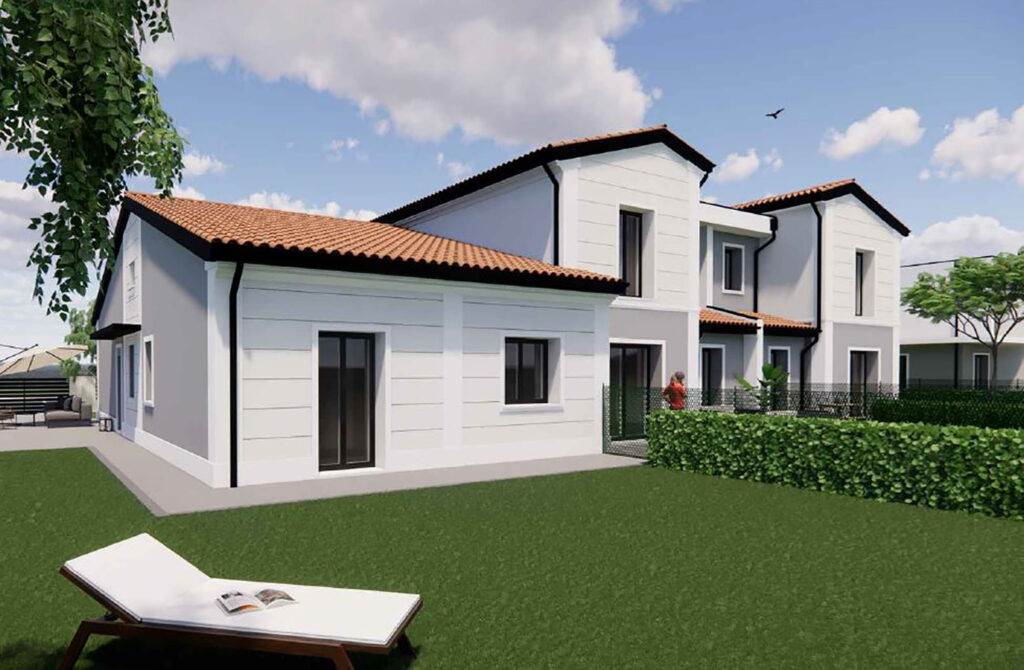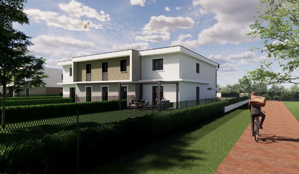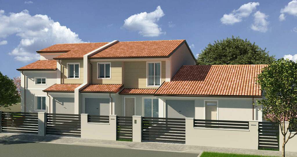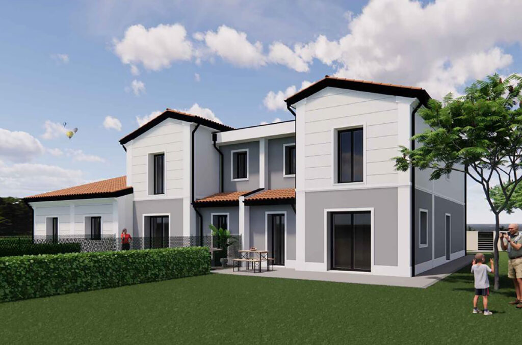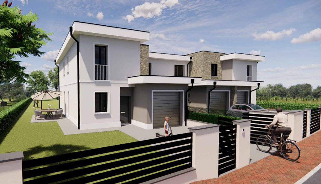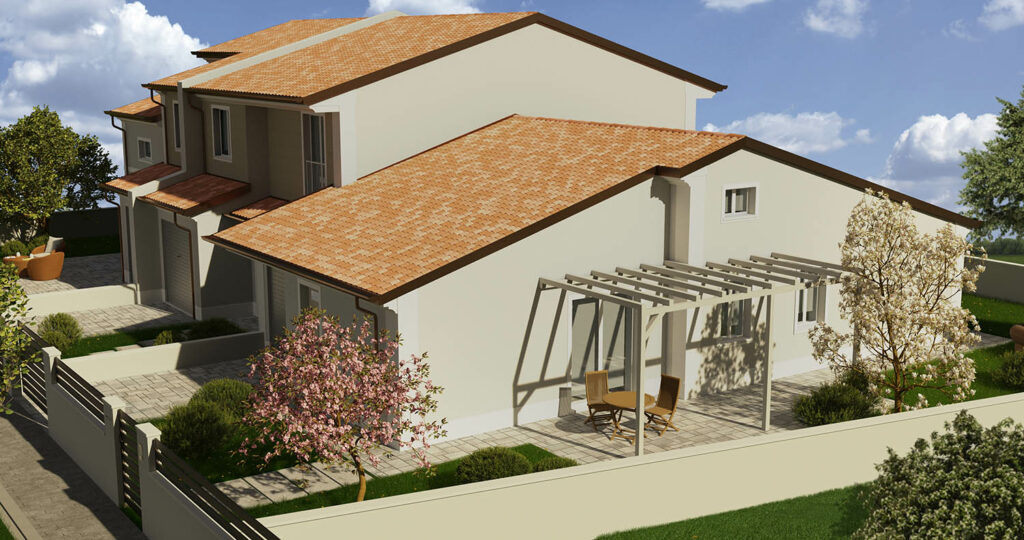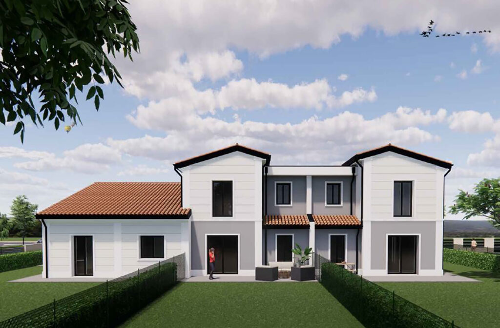 La tipologia trifamiliare proposta si compone di due villette su due piani fuori terra con: