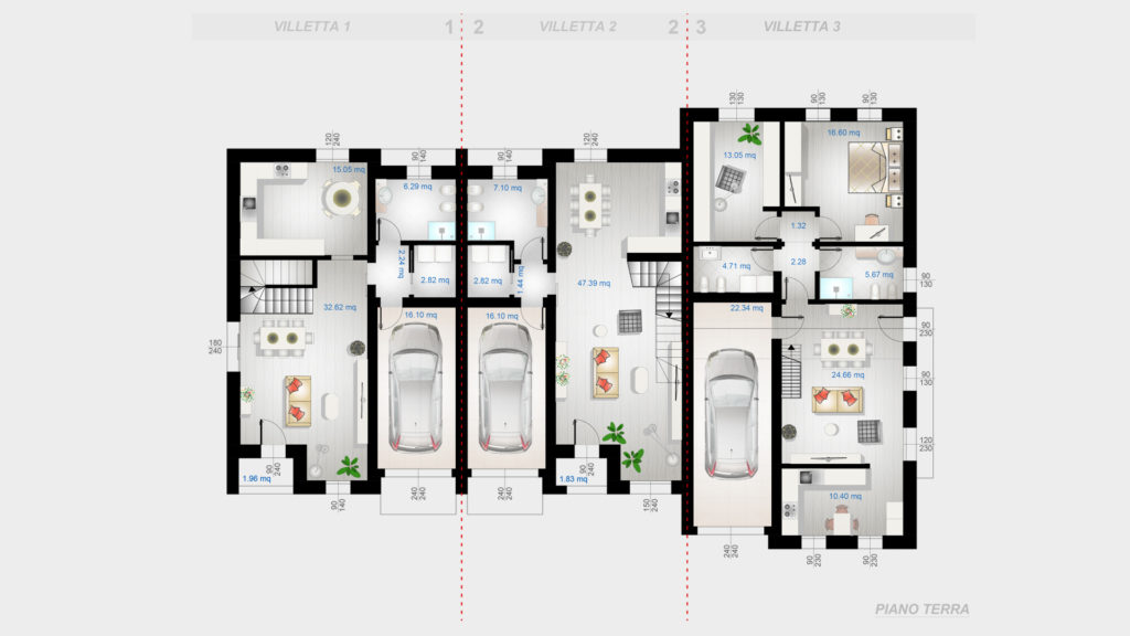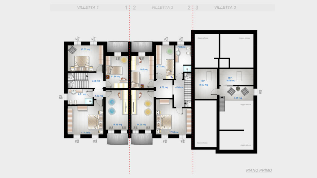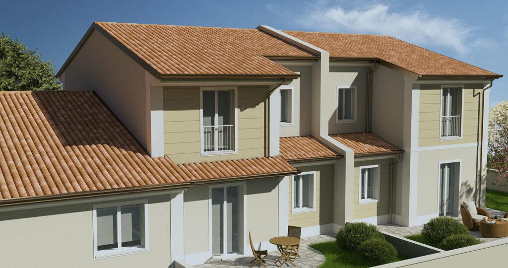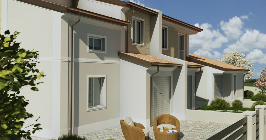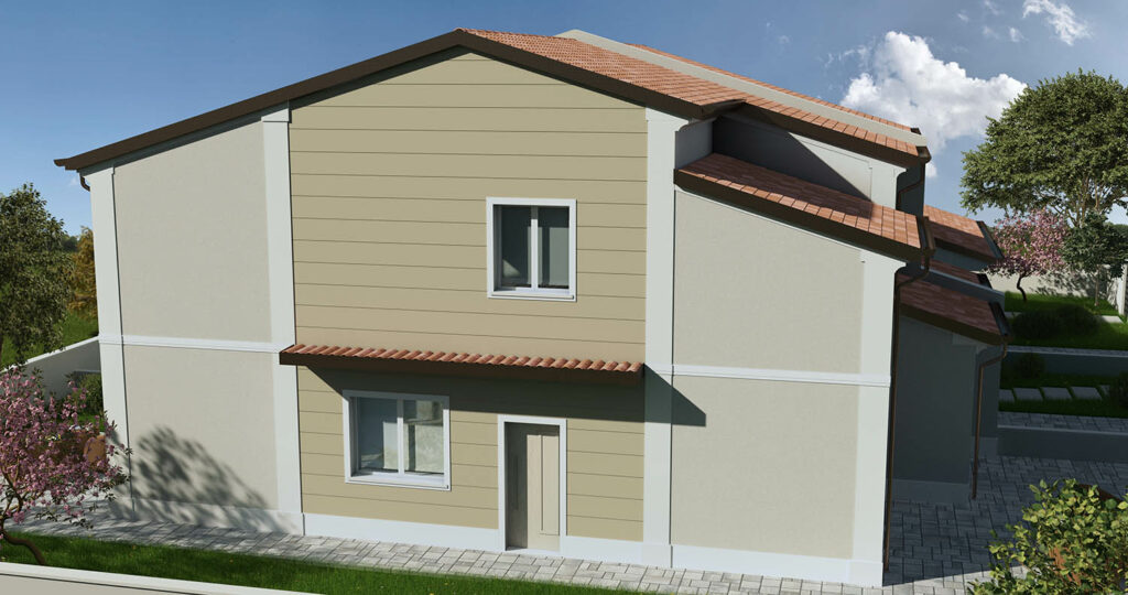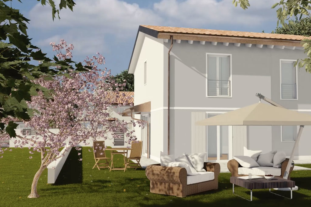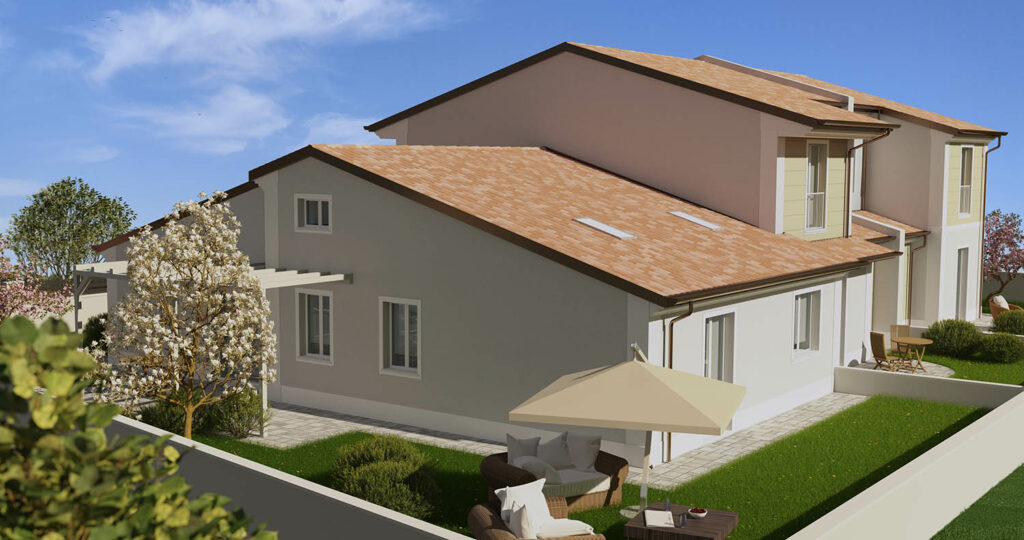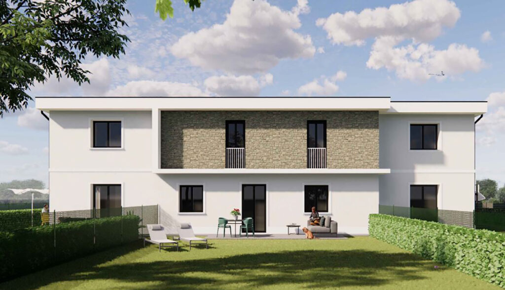 La tipologia trifamiliare proposta si compone di due villette su due piani fuori terra con:
